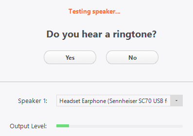 - The meeting will display a pop-up window to test your speakers. If you don't hear the ringtone, use the drop-down menu or click No to switch speakers until you hear the ringtone. Click Yes to continue to the microphone test.