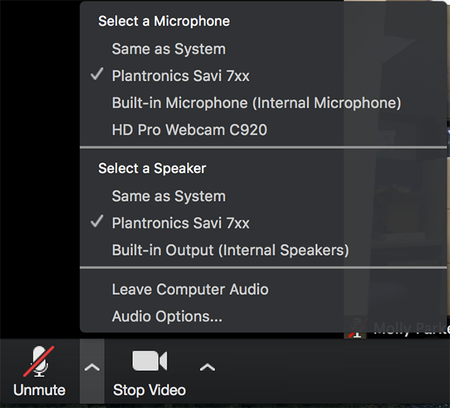 - In the meeting controls, click the arrow next to Mute/Unmute.